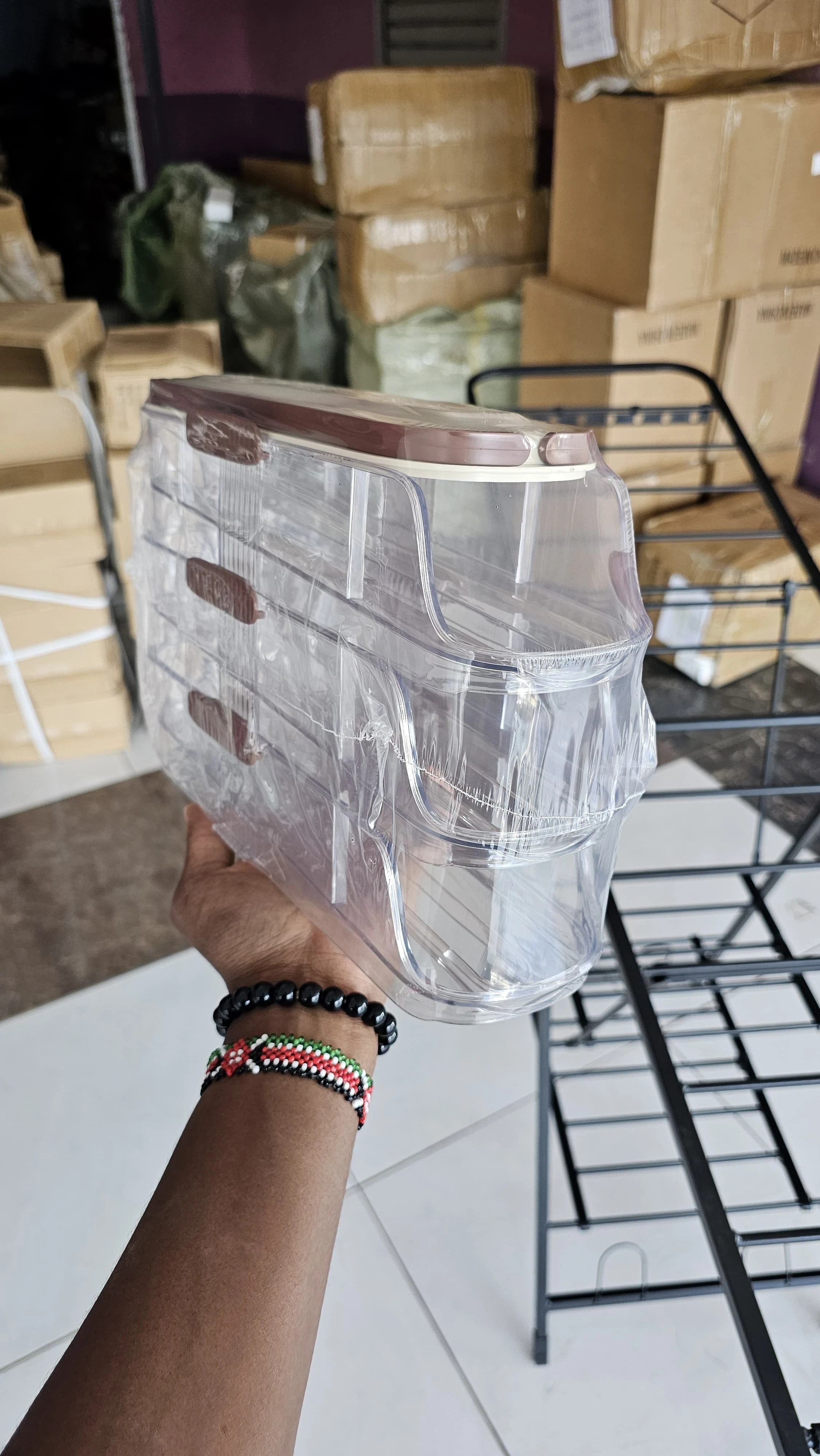 Keep your kitchen organized and your eggs protected with the Acrylic Stackable Automatic Rolling Egg Storage Box.